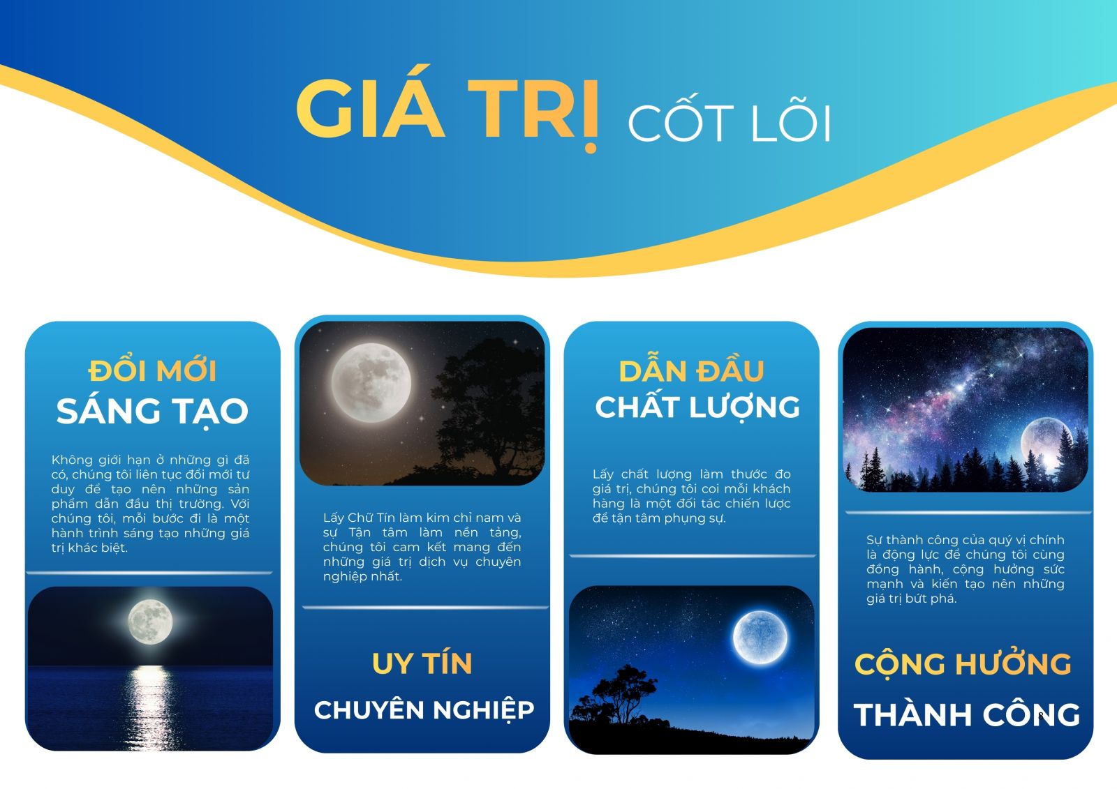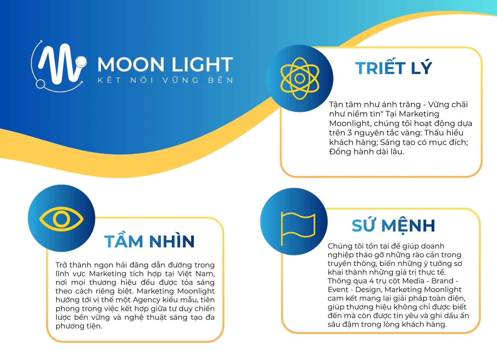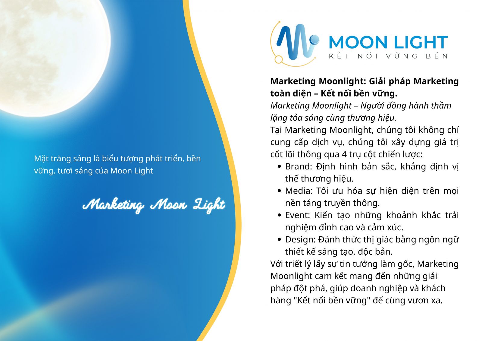 "Khi mặt trời lặn, ánh trăng là thứ dẫn lối. Khi thị trường bão hòa, Moonlight Marketing là người đồng hành cùng thương hiệu của bạn tìm thấy lối đi riêng."